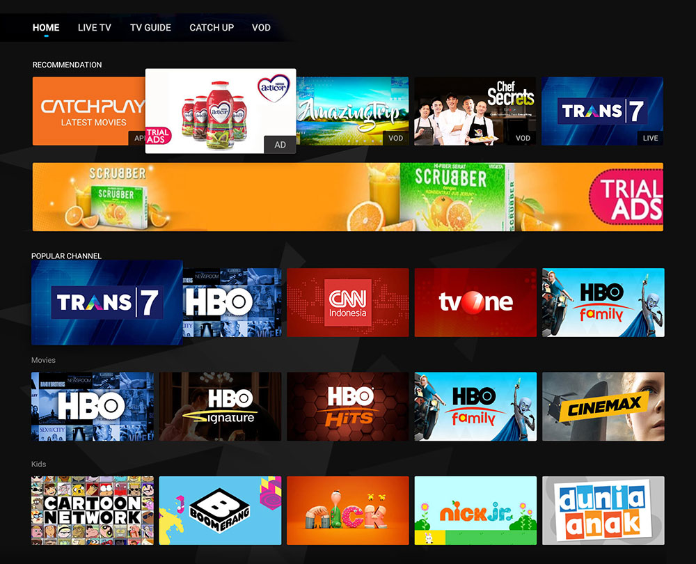 100+ pilihan nonton saluran Live TV lokal maupun mancanegara dan saluran favorit keluarga Anda.